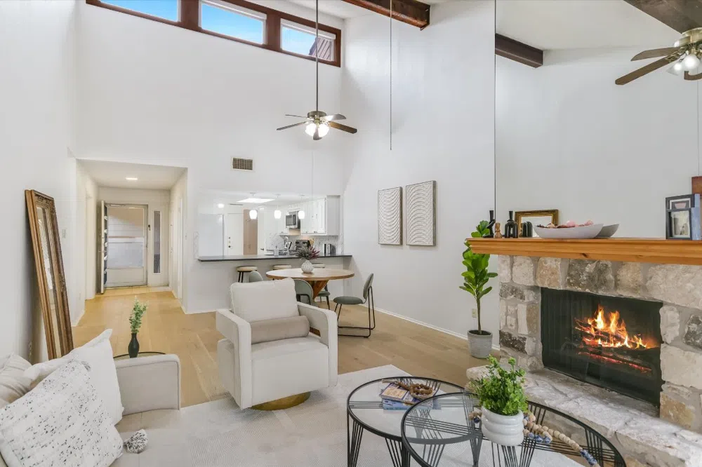 Fabulous single-story townhome w/two-car garage in highly desirable NW Hills location! End unit w/no back neighbors & side greenspace provides for nice views & private feel. This unit features an open layout, vaulted ceiling in the living & dining areas, updated windows, fresh interior paint, hardwood floors in living/dining area & 2 very spacious bedrooms. The kitchen, which opens to the living area, boasts quartz countertops w/ tile backsplash, updated tile flooring, additional cabinet/storage space & breakfast area for cozy dining or home office space. The large living/dining area is complete with soaring ceiling for great natural light, brick fireplace, built-in bookcase & opens to private back patio great for relaxing or enjoying morning coffee. Large primary suite plus another spacious secondary bedroom. Superb location in complex on the corner & across from the community pool. Enjoy convenient NW Hills amenities close to shopping, dining & Dell Community Center.